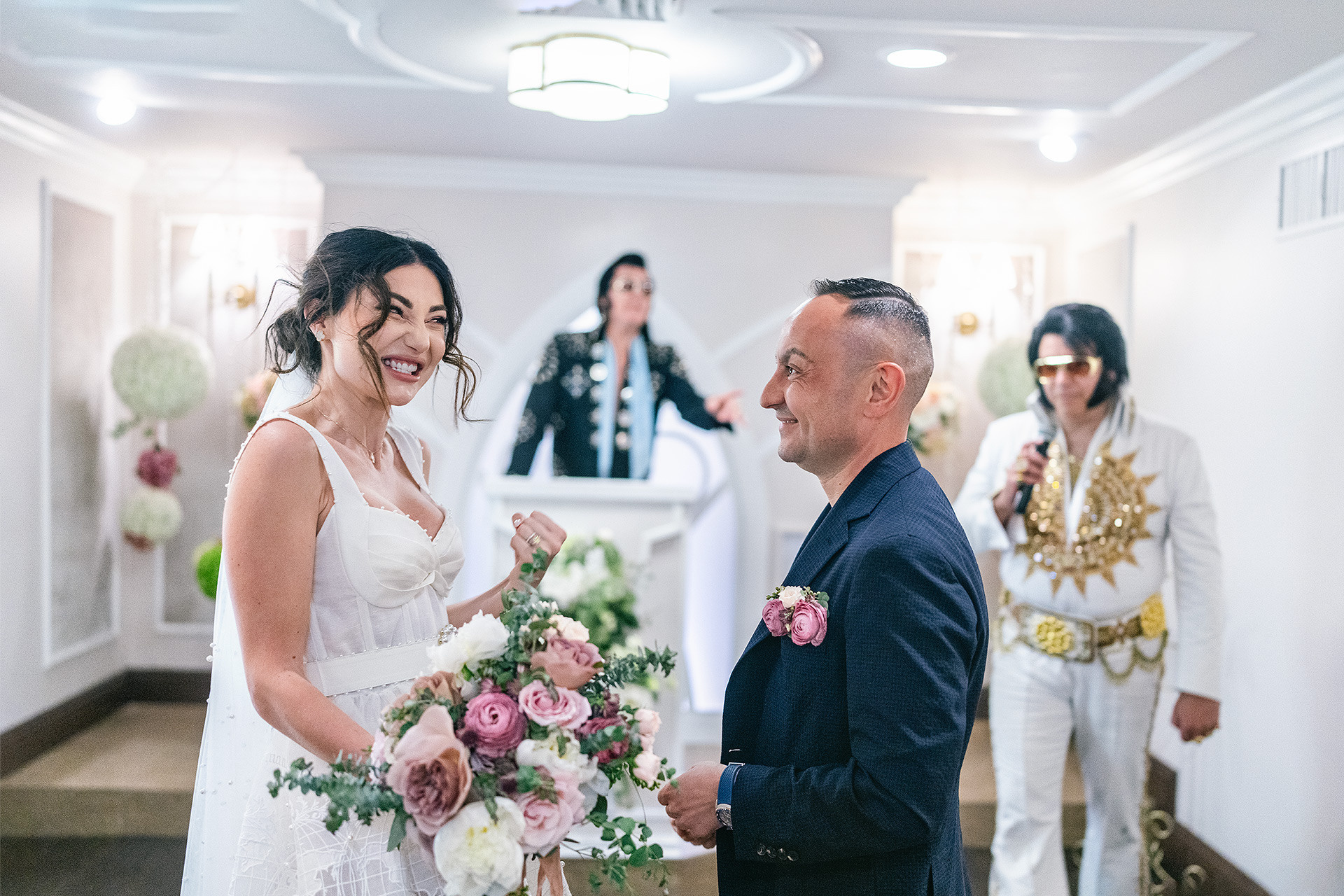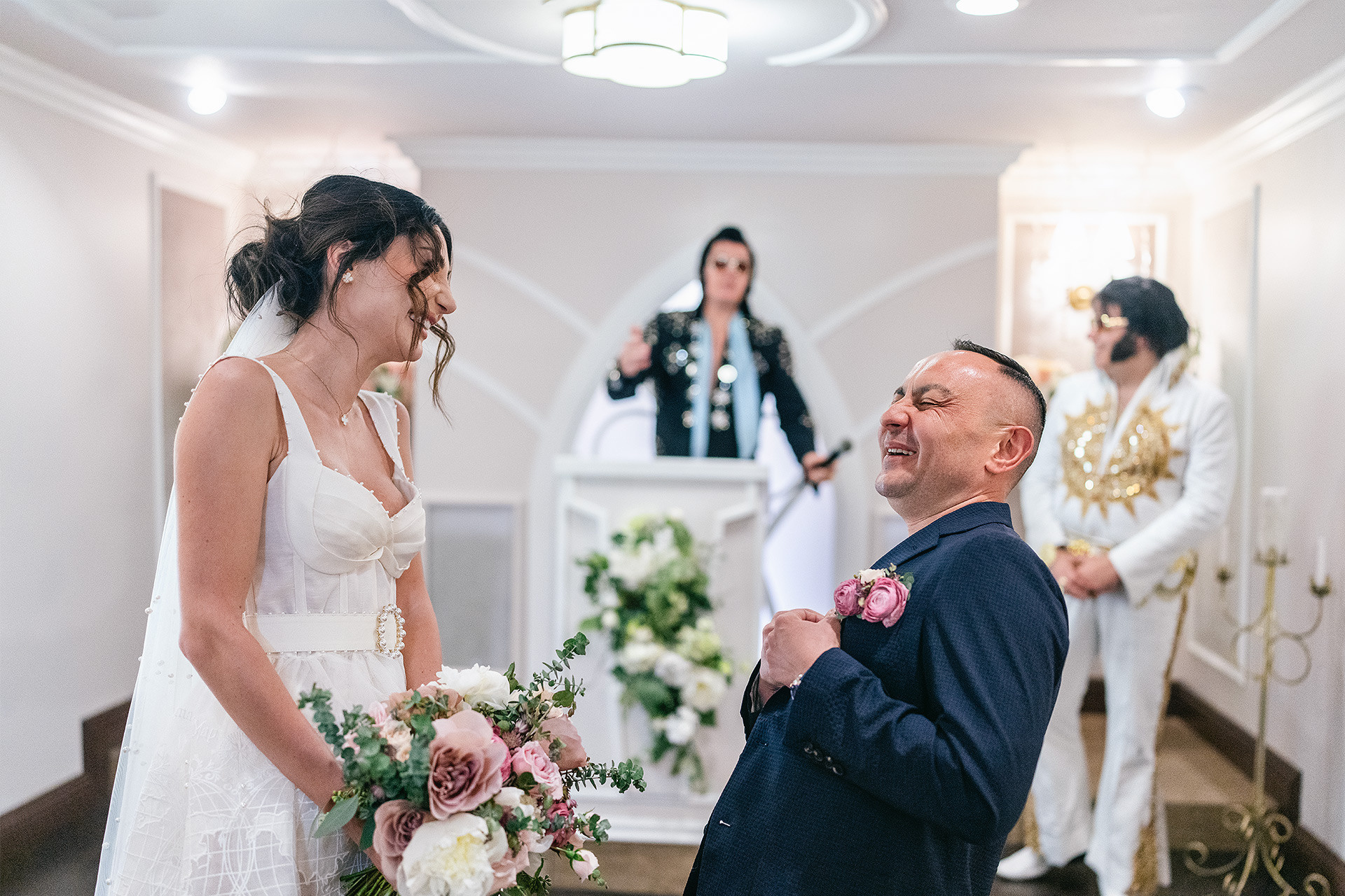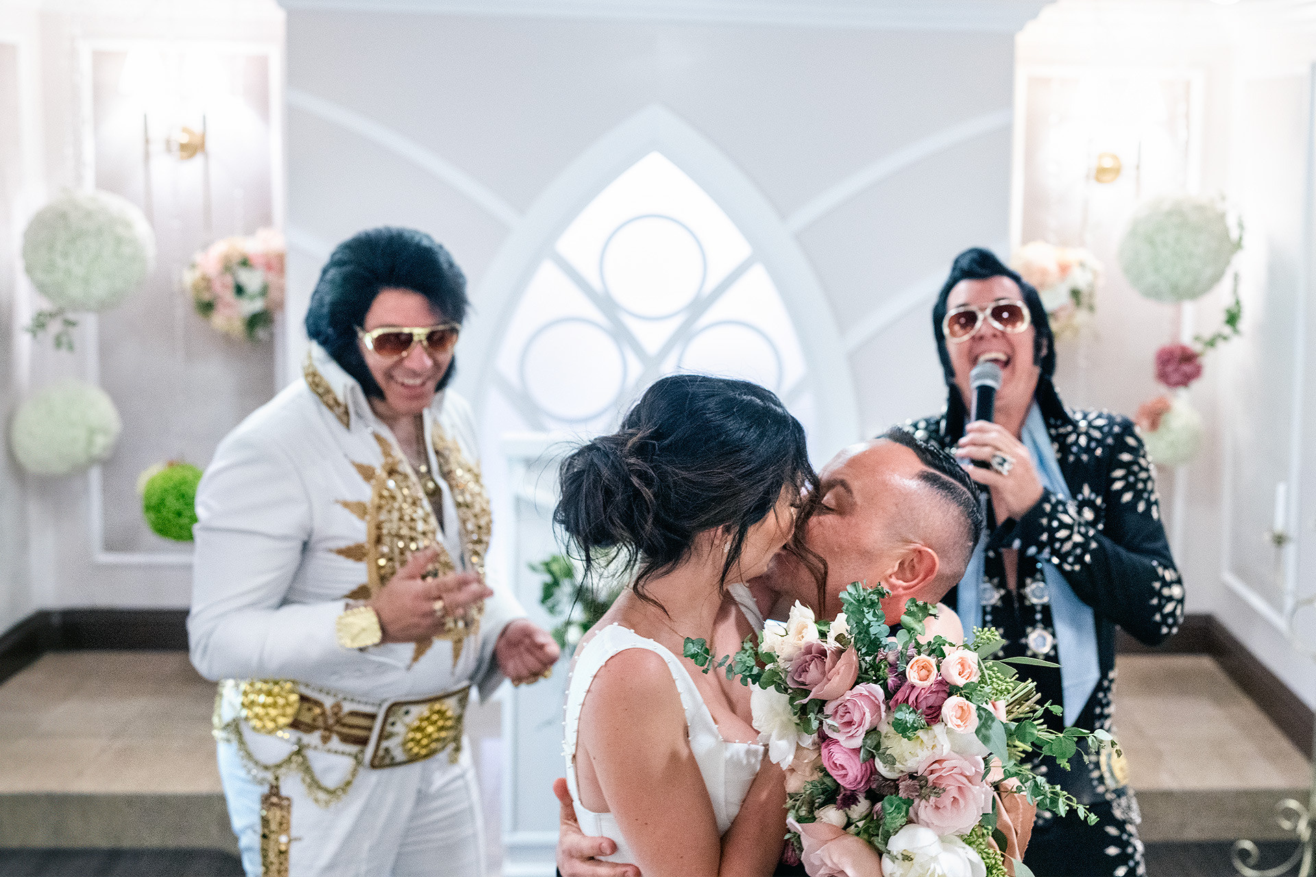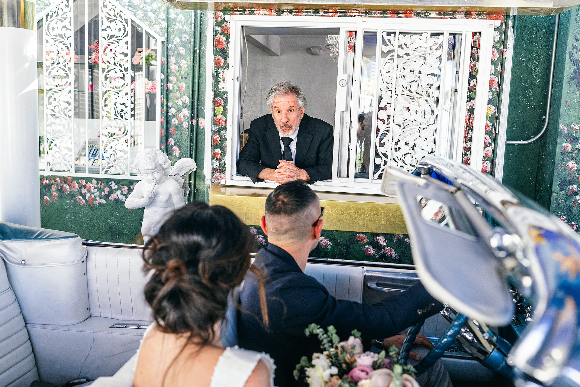 A drive-thru ceremony in a vintage convertible and a tiny chapel with two Elvis impersonators — pure joyful madness that perfectly reflected who they are.
