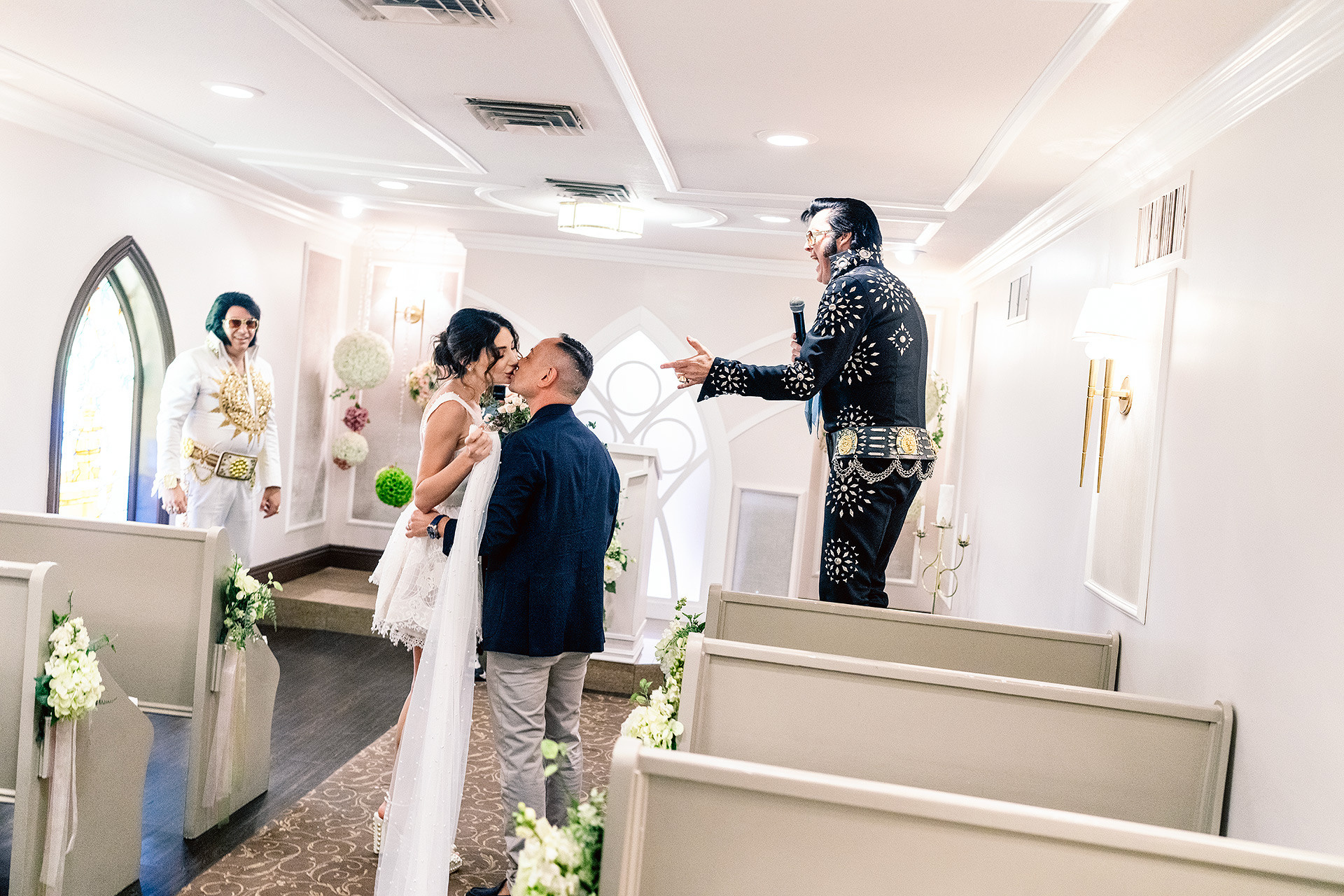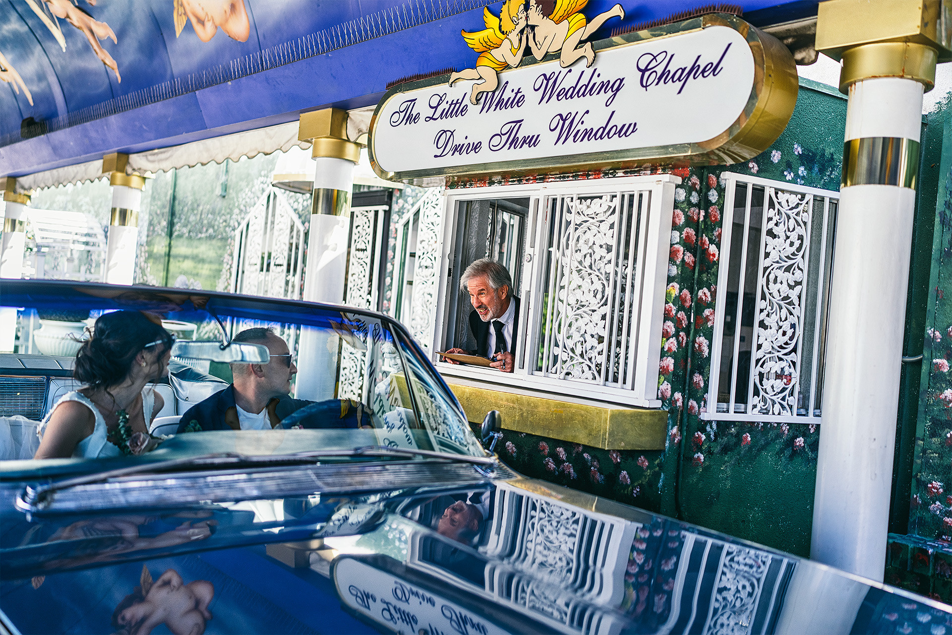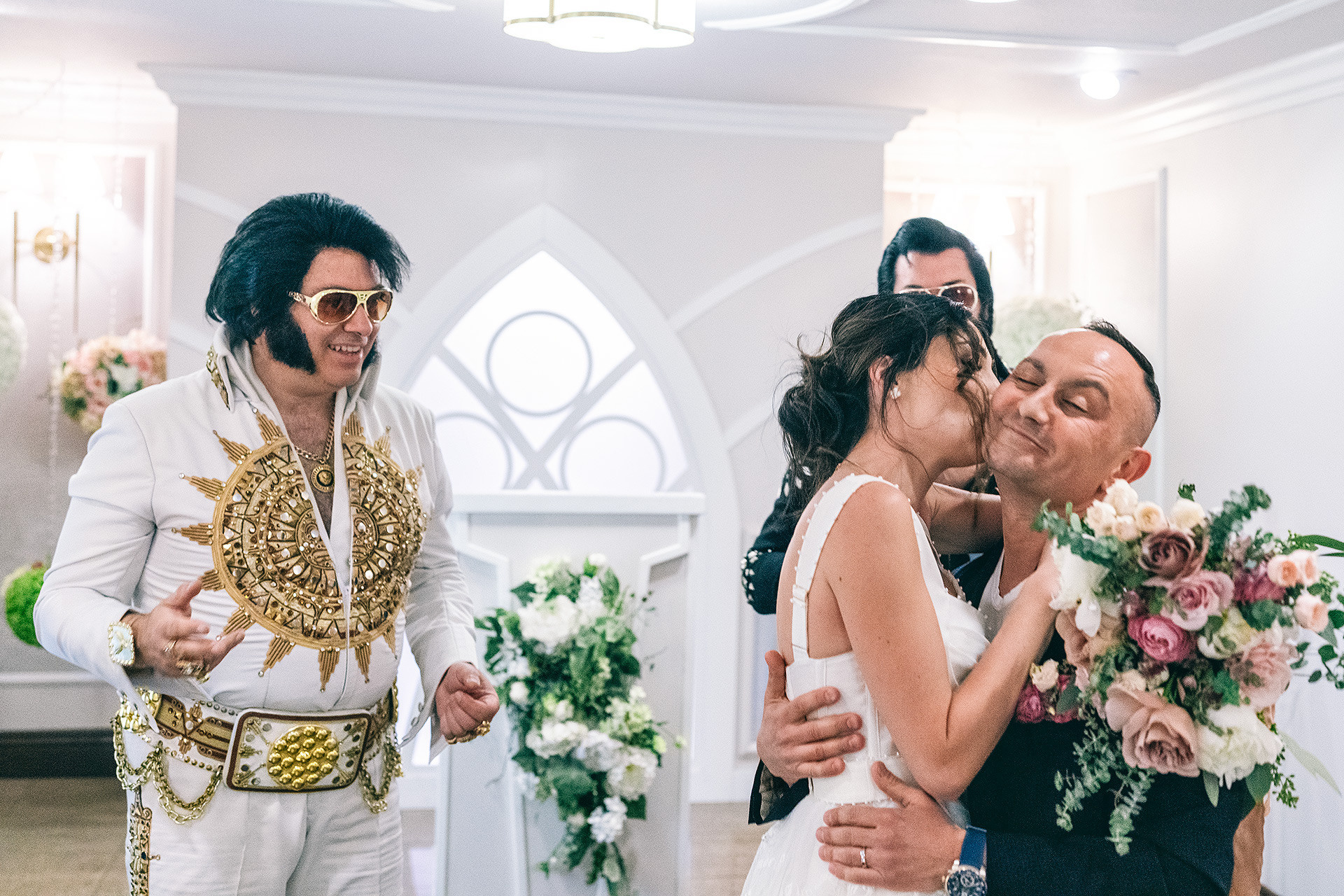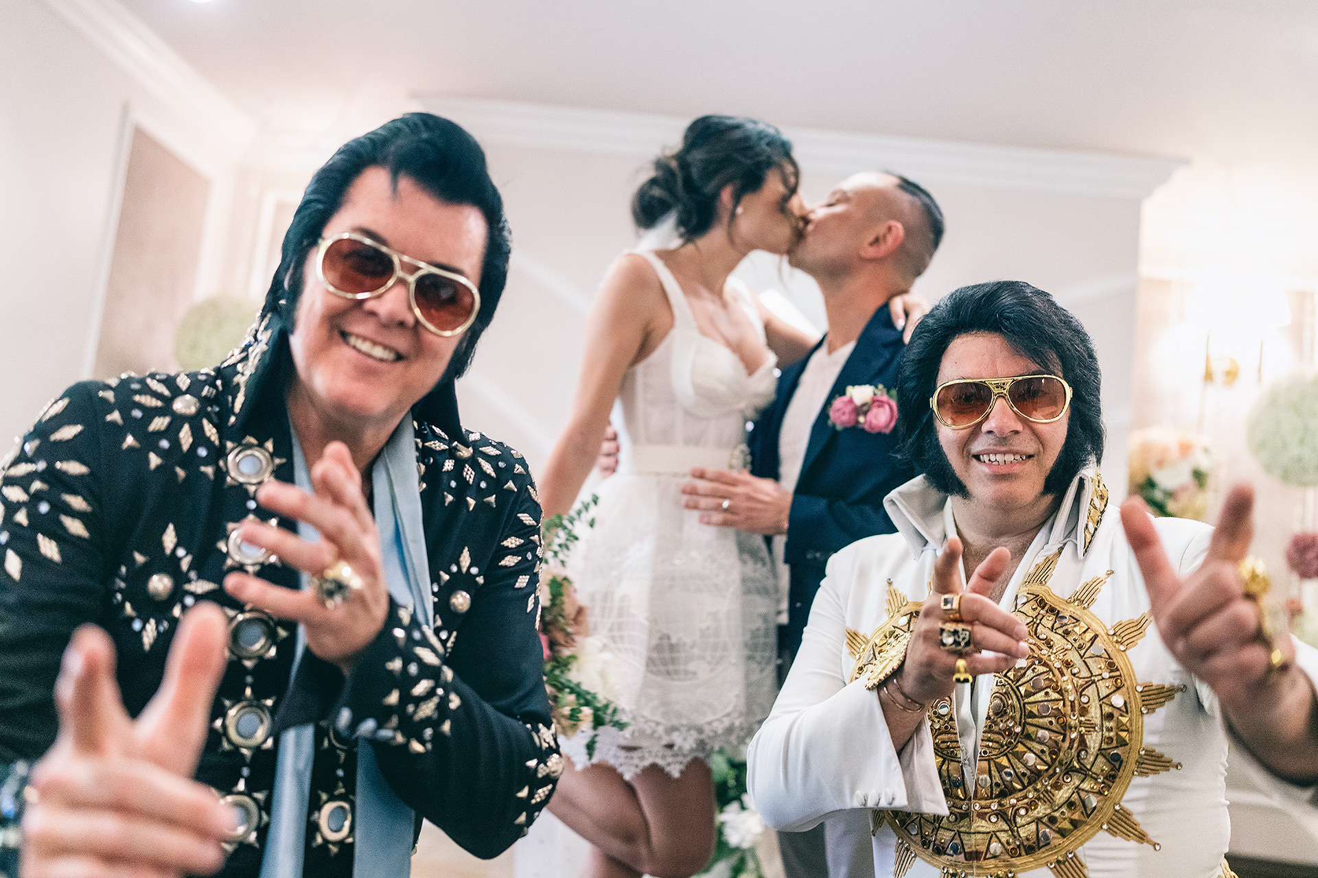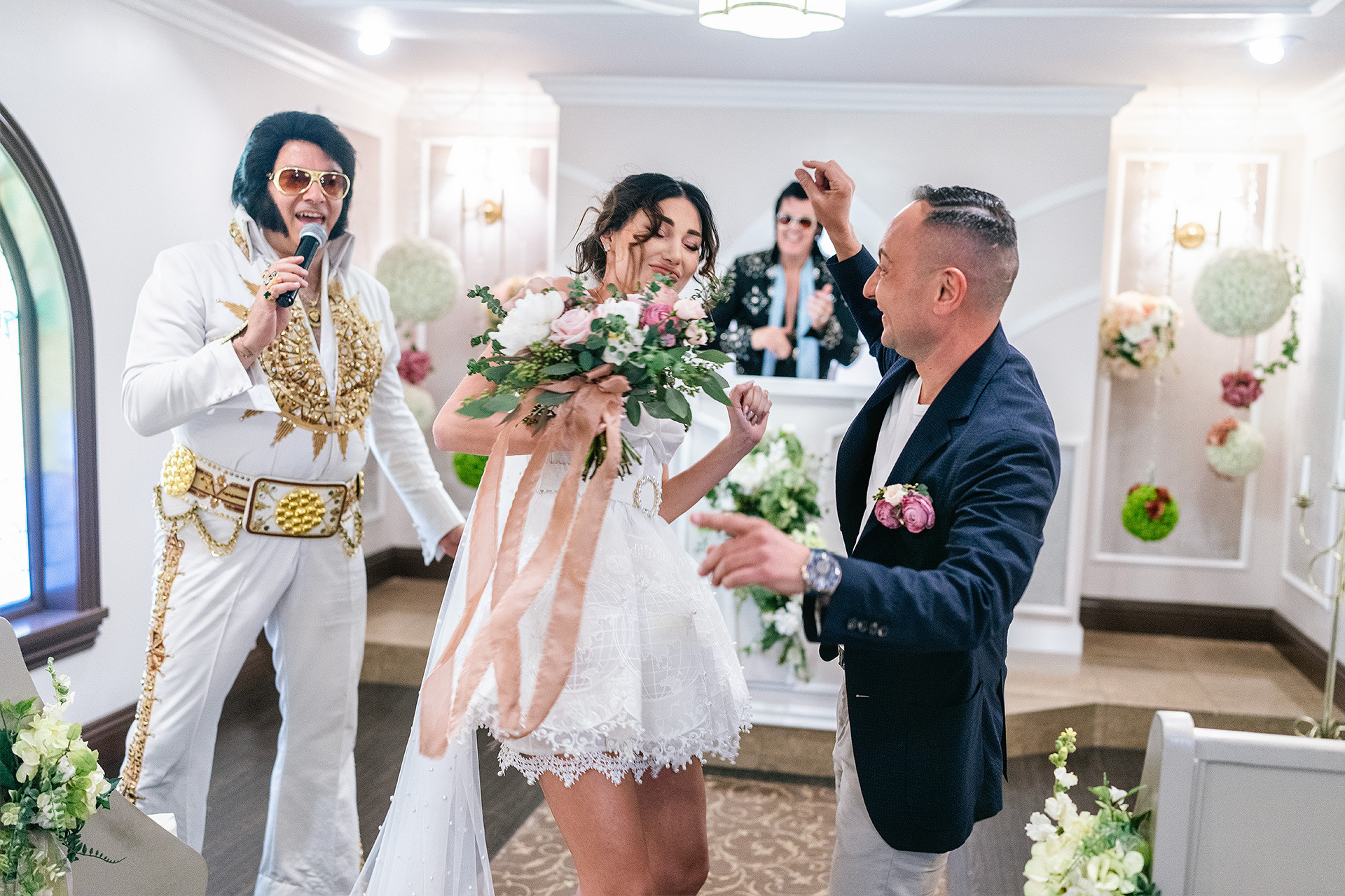 A drive-thru ceremony in a vintage convertible and a tiny chapel with two Elvis impersonators — pure joyful madness that perfectly reflected who they are.