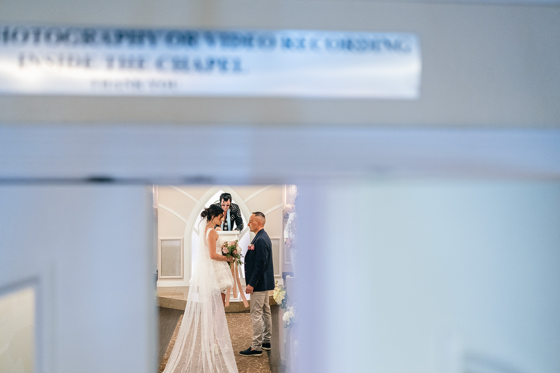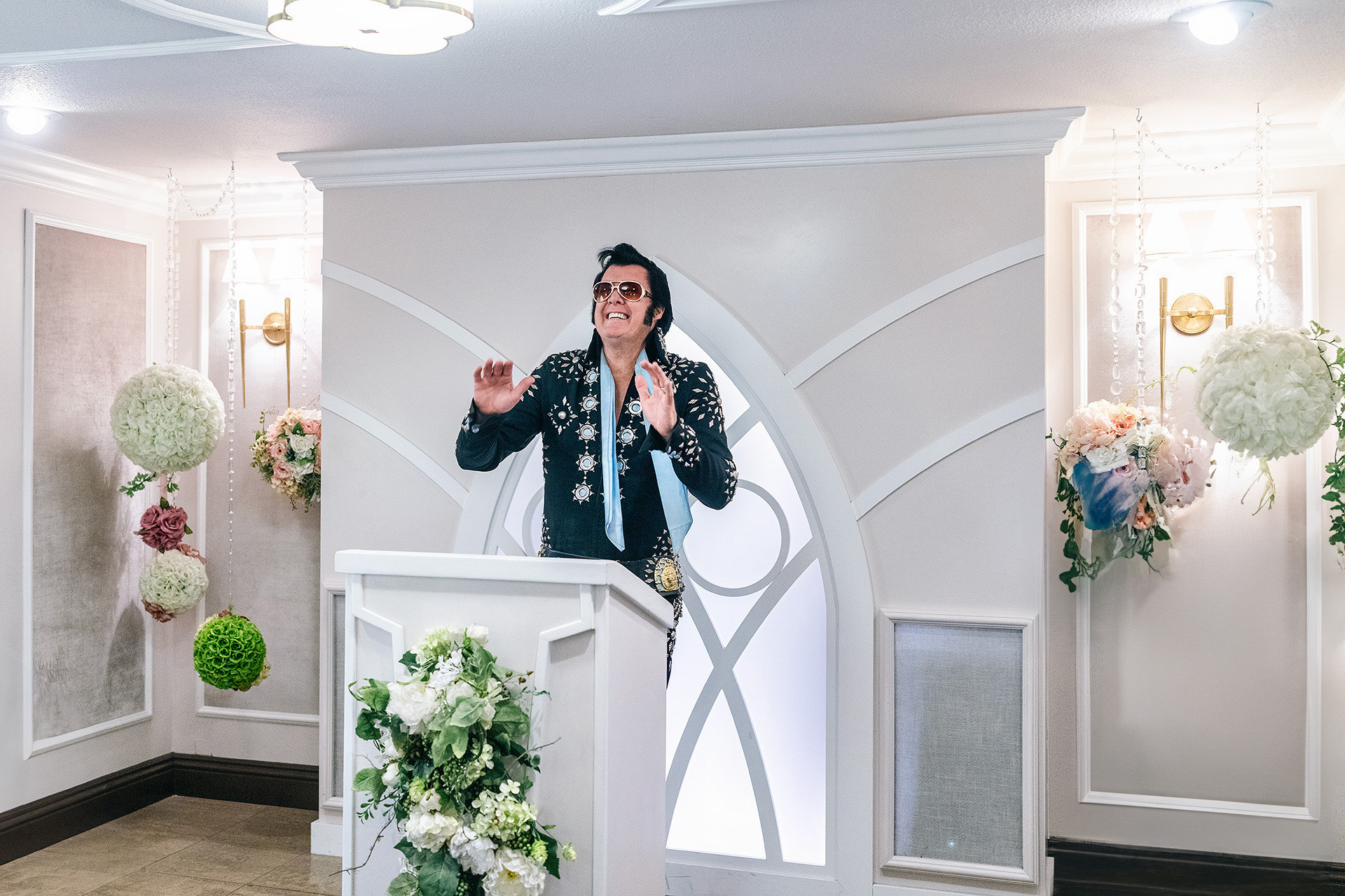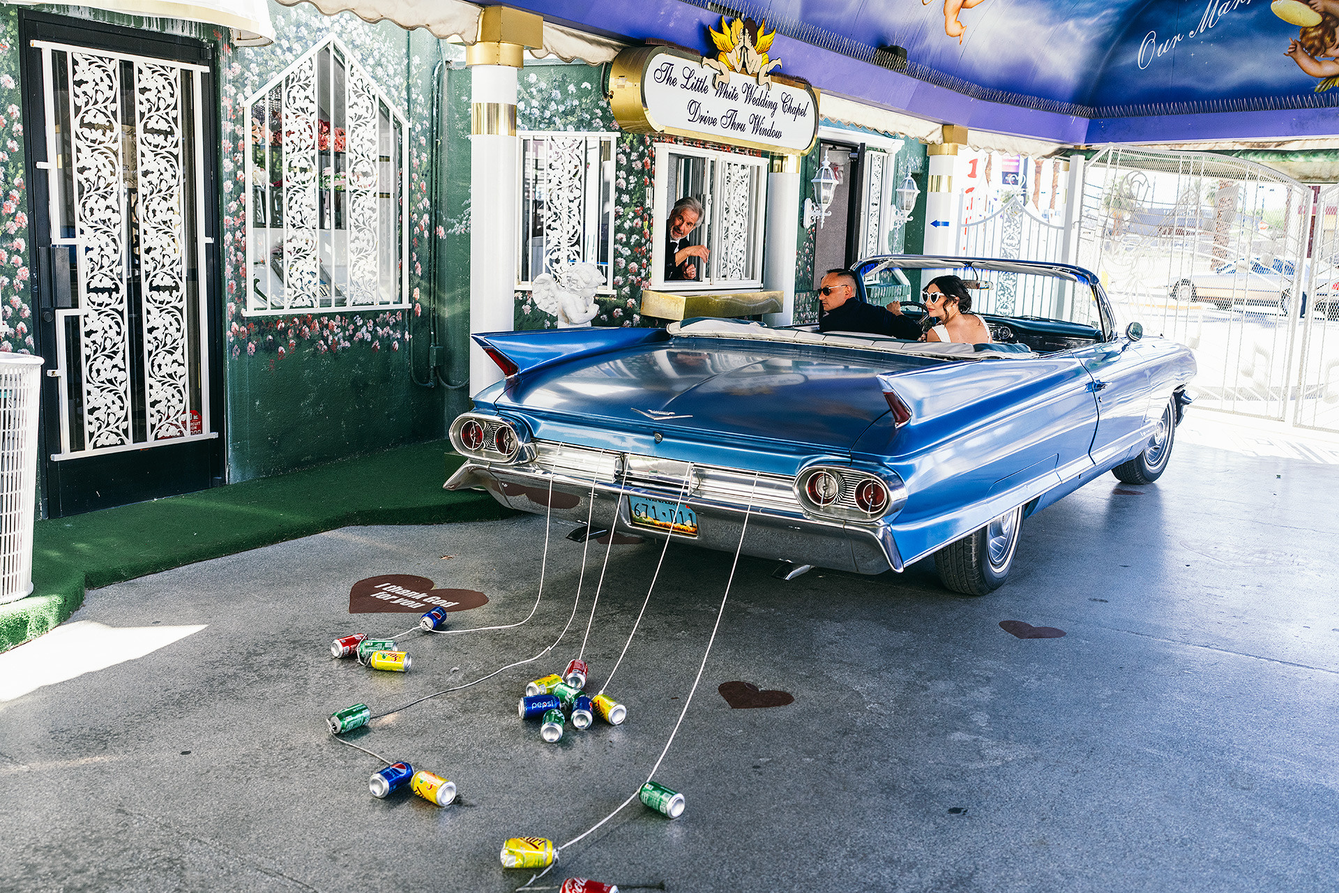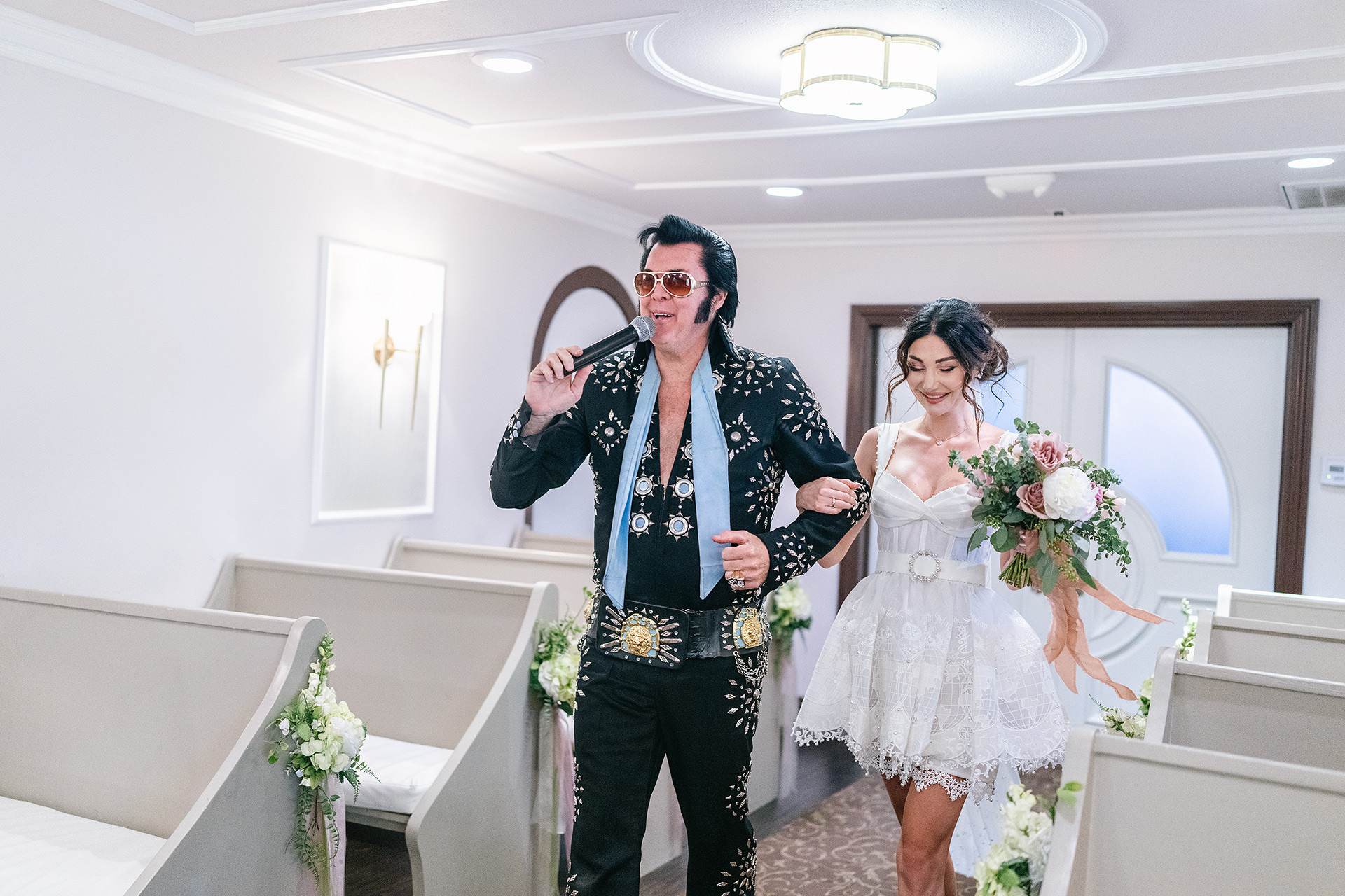 A drive-thru ceremony in a vintage convertible and a tiny chapel with two Elvis impersonators — pure joyful madness that perfectly reflected who they are.