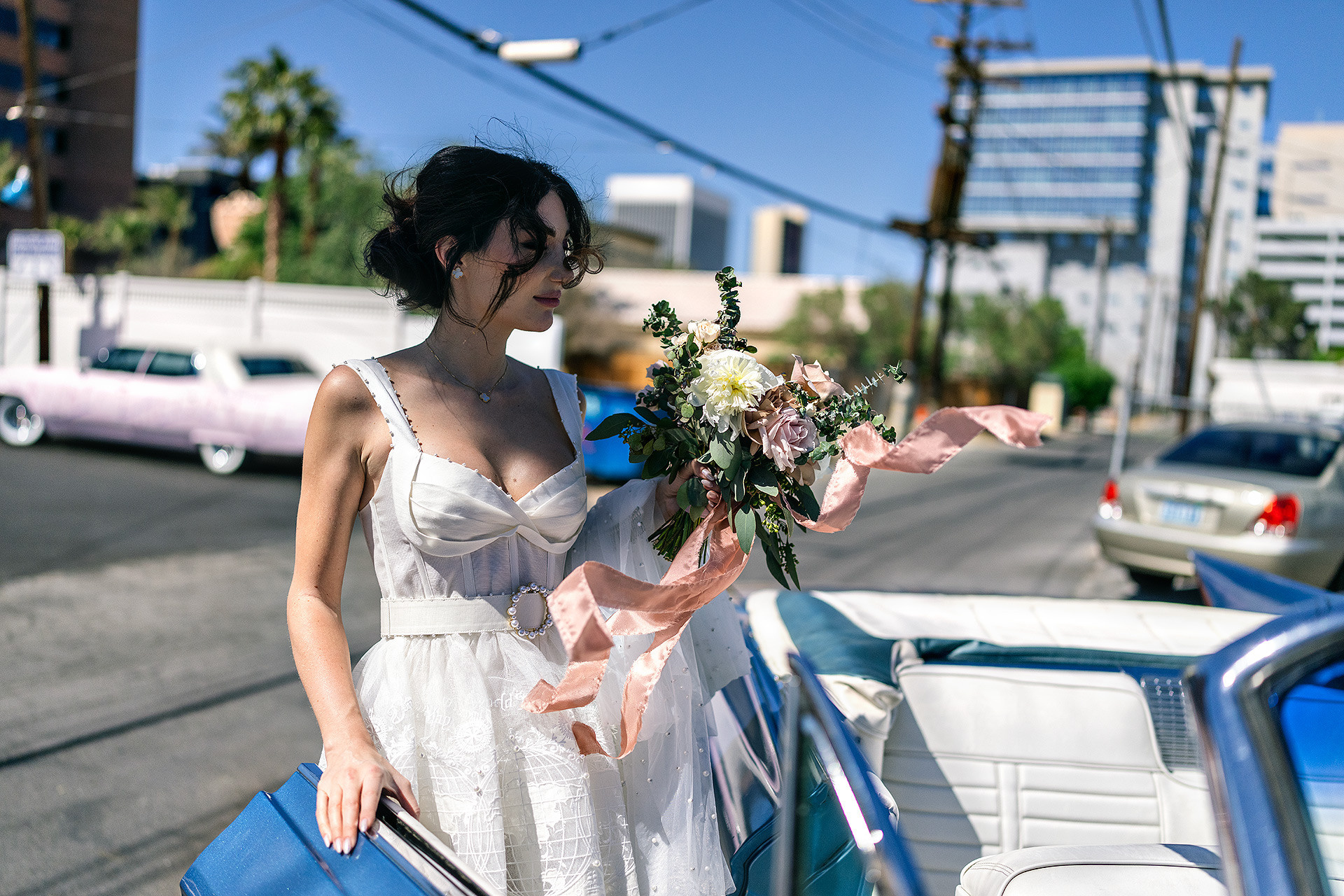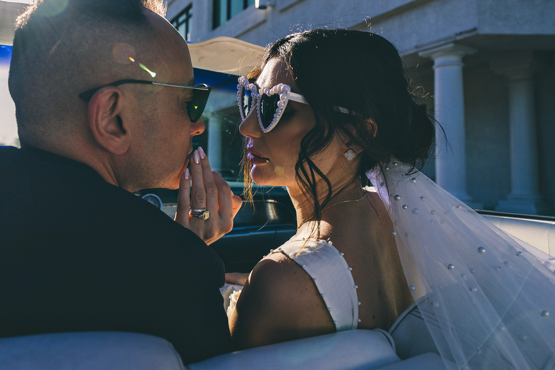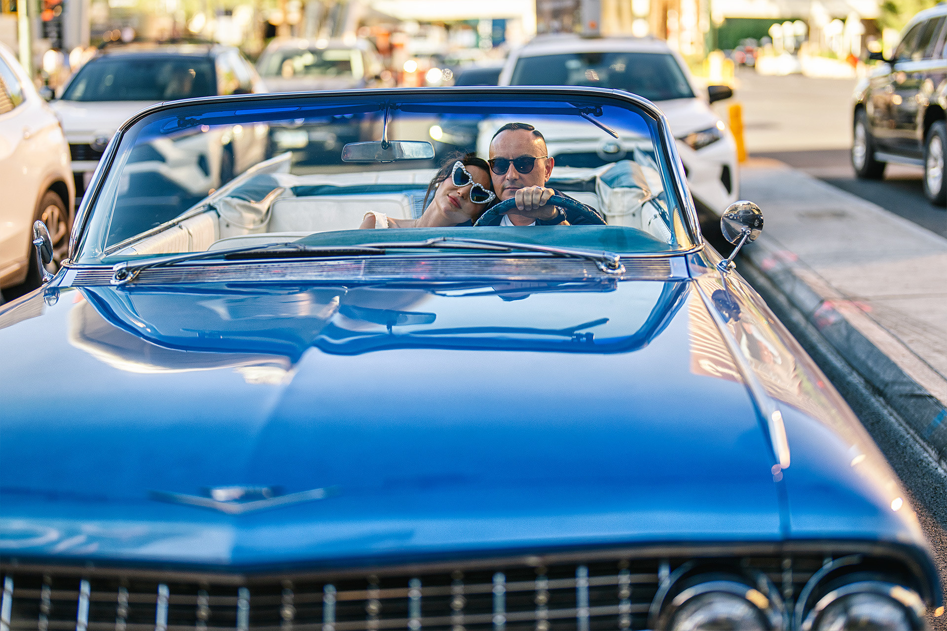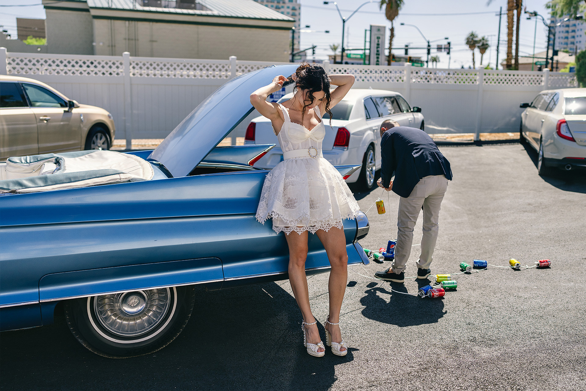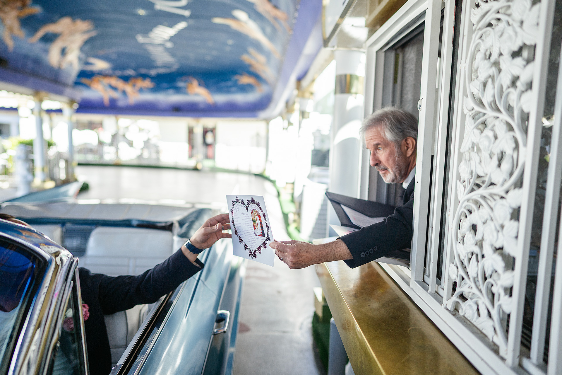 A drive-thru ceremony in a vintage convertible and a tiny chapel with two Elvis impersonators — pure joyful madness that perfectly reflected who they are.